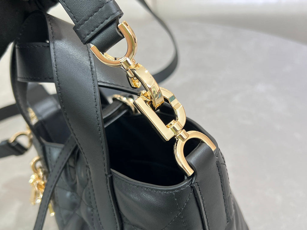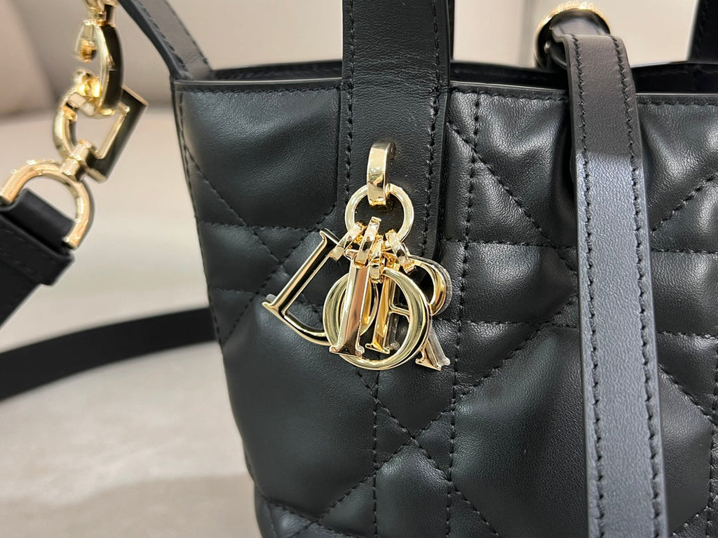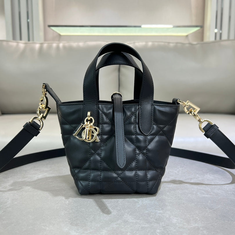 .This miniature Toujours vertical handbag is a new product from the Autumn 2025 Ready-to-Wear collection, combining fashion and practicality. Meticulously crafted from black cowhide leather, it is adorned with oversized Cannage topstitching. The spacious interior compartments can hold various daily essentials. It features a slender leather tie closure for safely storing items, and also has a light gold-finish metal CD Lock letter D knob clasp that can adjust the sides, enhancing the style. The top leather handle comes with a detachable leather shoulder strap, allowing for hand carrying, shoulder carrying, or crossbody use.
