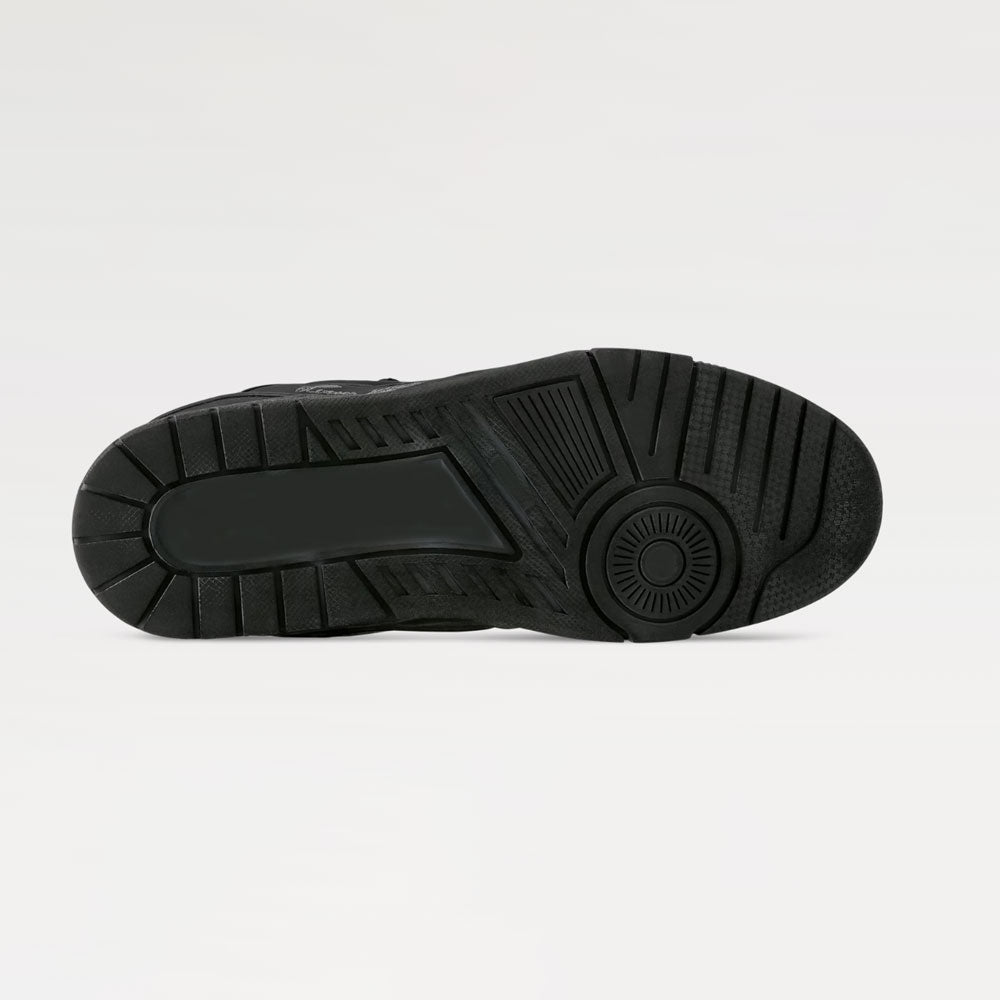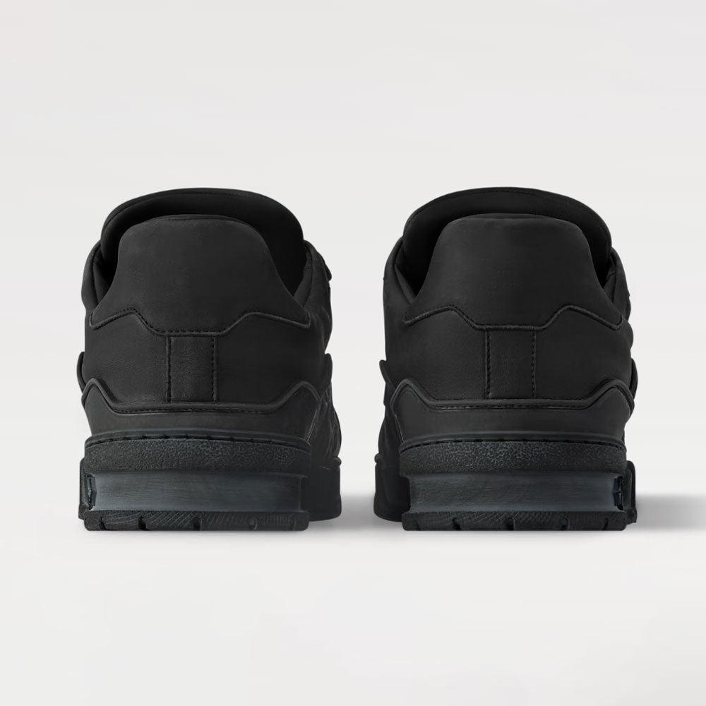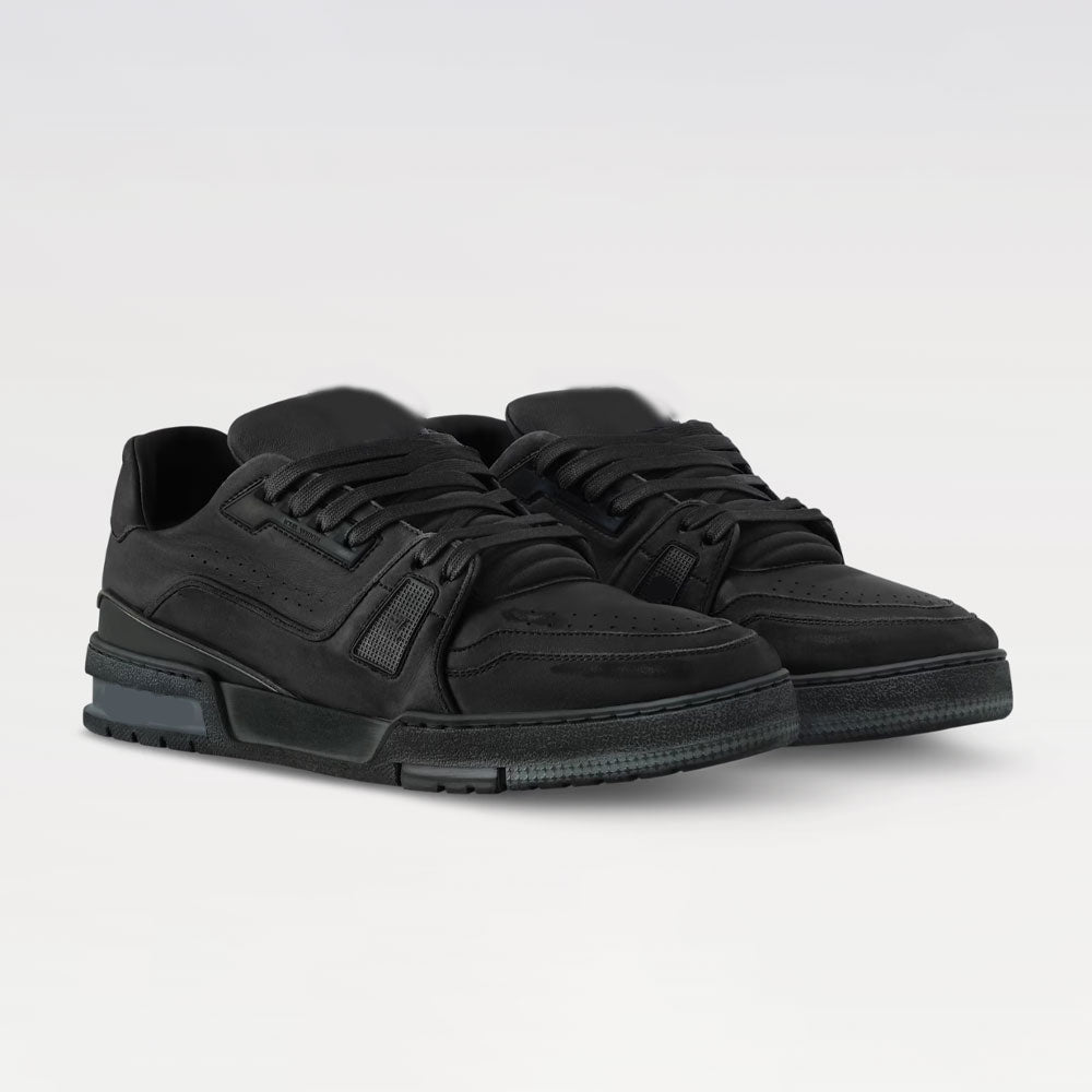 The ?Trainer sneaker is reinterpreted in smooth calf leather with a distinctive vintage effect . The elaborately constructed upper offers unique suppleness and features rubber detailing and the script signature on the side. The very flexible rubber outsole which provides extra comfort, is decorated with Monogram Flowers, and is matched to the upper for a smart look.
