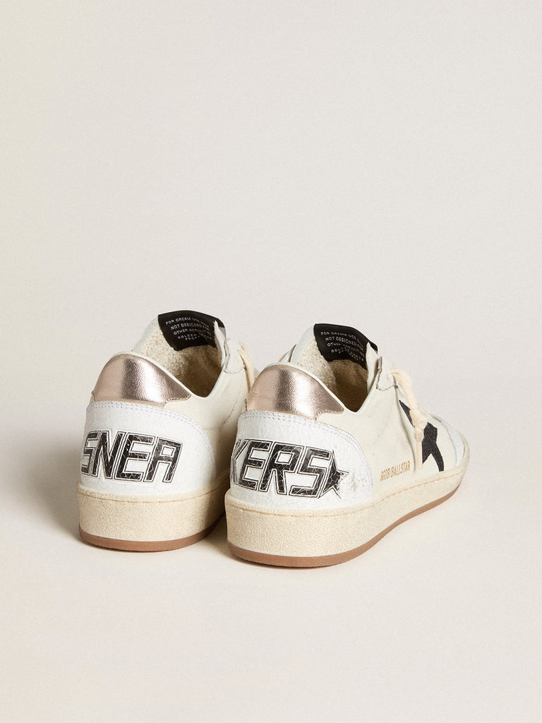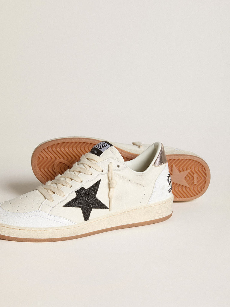 Dreaming of the Eighties. Our Ball Star sneakers have an American college vibe caught between a hoop shot and a skateboard ride. This model with a white nappa leather upper features a black glitter star and a quartz-colored metallic nappa leather heel tab. The white crackle leather inserts and white laces add the finishing touch: beautiful things that never go out of fashion.