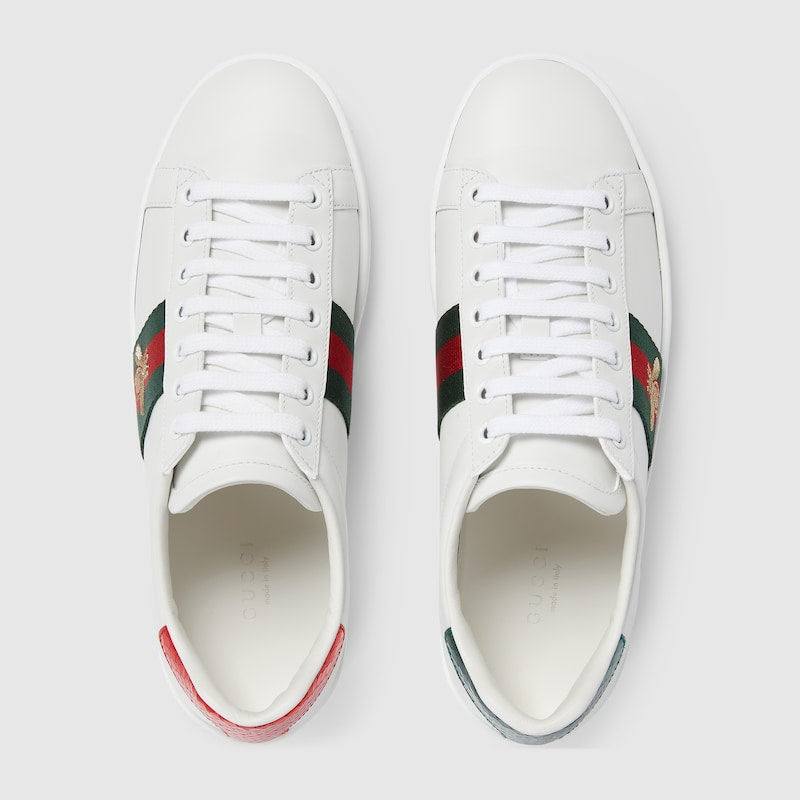 The House's classic low-top sneaker is embellished with the gold embroidered bee against the green and red Web. The bee is an archival code first introduced in GG ready-to-wear in the 1970s.